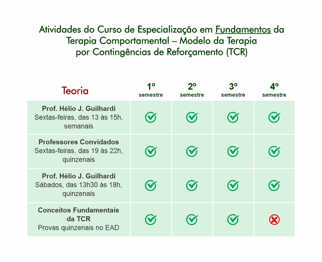 Os alunos completam sua formação conceitual fazendo uma disciplina, denominada Conceitos Fundamentais da Terapia por Contingências de Reforçamento (TCR), realizado na plataforma EAD.