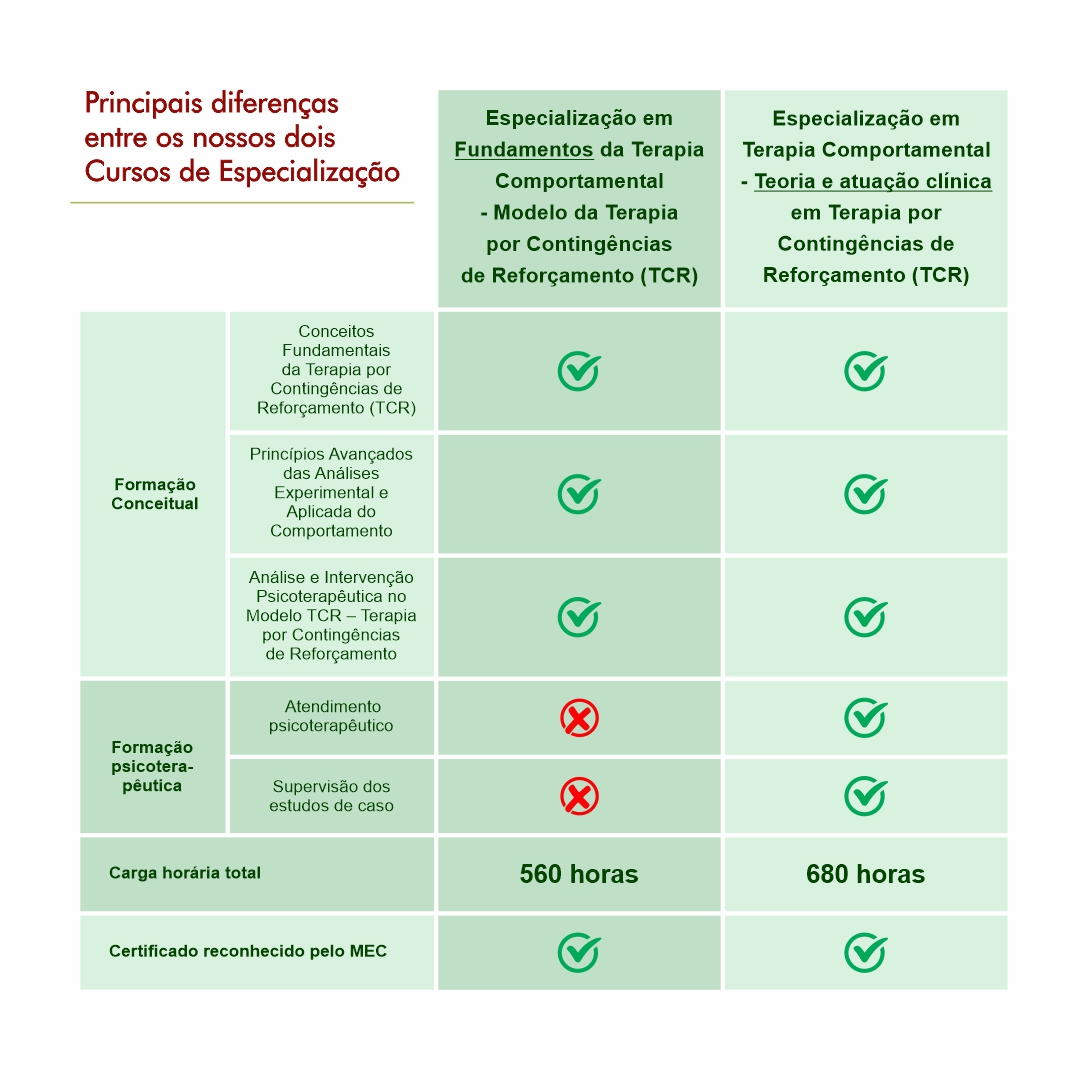 O curso tem por objetivo levar o aluno a compreender o que fundamenta a atuação do psicoterapeuta clínico-comportamental, dentro do modelo da Terapia por Contingências de Reforçamento (TCR), com amplo aprendizado de conceitos da Análise do Comportamento e do Behaviorismo Radical. A ênfase do curso é compreender os conceitos do Behaviorismo Radical e da Ciência do Comportamento como os fundamentos da Terapia por Contingências de Reforçamento (TCR).